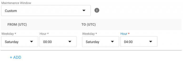 The Custom option is used to limit the replacement of on-demand instances to specific time windows. Multiple maintenance time windows can be selected. Below is an example of a maintenance time window set for Saturdays, from 00:00 (UTC) to 04:00 (UTC).