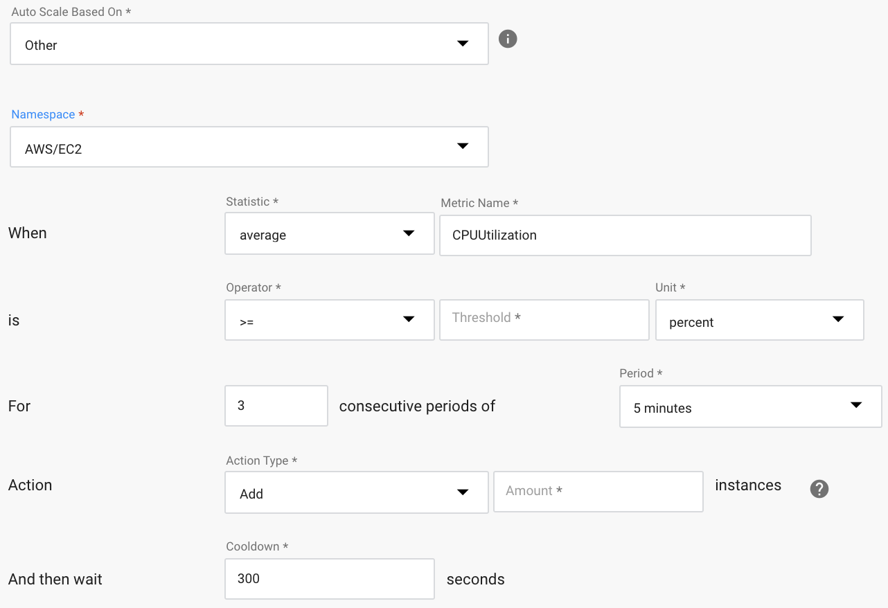 If you want to autoscale based on a custom metric, complete the form described above and choose Other in the Autoscale Based on field.