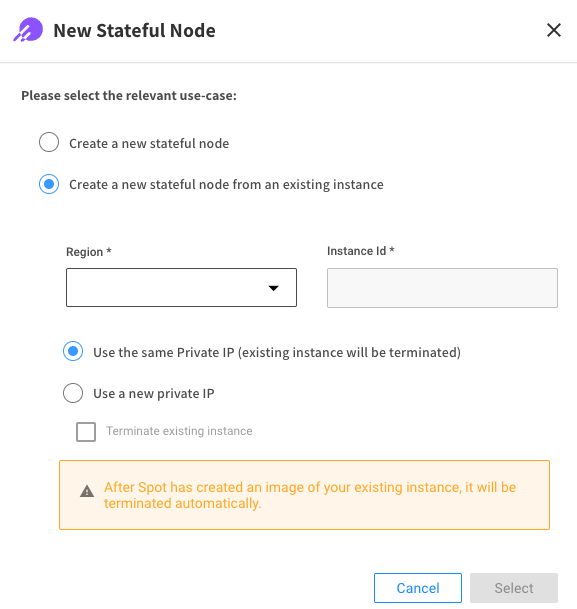 Mark the use-case Create a New Stateful Node and click Select.