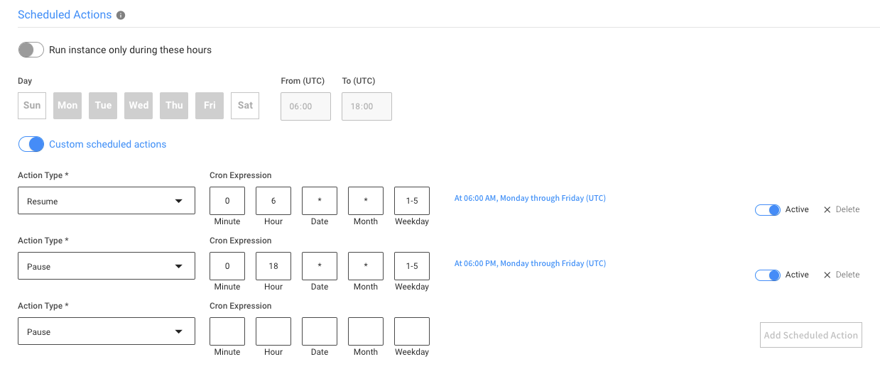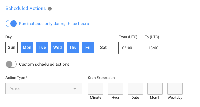 You can choose one of two options – predetermined Running hours, or custom scheduled actions.