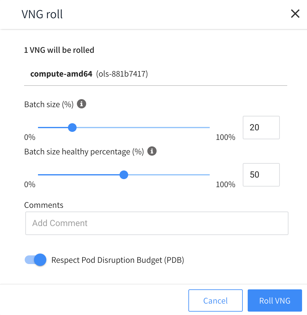 4. Enter the Batch Size and Comments, indicate whether you want to respect the pod disruption budget, and click Roll VNG(s).
