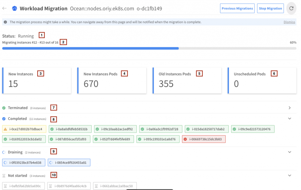 • Terminate Instances – Ocean terminates the old instances once the pods that reside in them are migrated, and the old instances are fully drained.